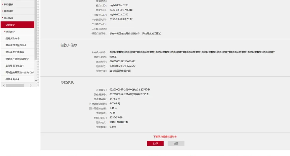 5、客户可在【网络融资-查询指令-贷款指令】功能,查看指令状态。